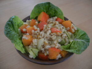 Budeme potřebovat asi 200 g velkých ječných krup, čtvrtinu dýně hokkaidó, jedno avokádo, 2 menší cibule, chilli koření, máslo (ideálně ghí), umeocet, sůl, pepř, mlsné jazýčky si ještě připraví vlašské ořechy a dýňový olej. Nejdříve uvaříme kroupy, slijeme je (vývar z krup je léčivý – nevylévat, je výborný při zánětu močových cest) a ochutíme umeoctem. Mezitím si osmažíme kousky dýně na másle, pro lepší chuť poprášíme chilli kořením, nejlepší jsou rozemleté uzené chilli papričky „chipotle“, osolíme a mírně opepříme. Po změknutí je přidáme ke kroupám a na zbylém tuku osmažíme na proužky nakrájené cibulky. Přidáme nakrájené avokádo, pyšnící se přezdívkou rostinné máslo a botanickým názvem hruškovec přelahodný, a vše promícháme. Můžeme přidat vlašské ořechy a salát na talíři pak ještě přelít troškou dýňového oleje. Dobu přípravy jsem změřila na 30 minut.