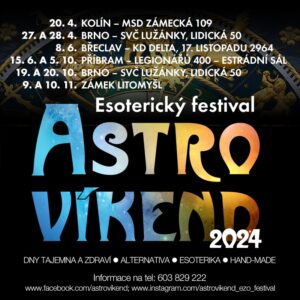 ASTROVÍKEND BRNO SVČ Lužánky, Lidická 50 Astrovíkend – zážitkový festival v duchu esoteriky, amazonských rituálů, filipínského duchovního léčení i přesvědčivých kartářů… Esoterický festival s názvem Astrovíkend, v jehož rámci se konají přednášky i výstavy, má již mnohaletou tradici v Brně, Litomyšli a nově…